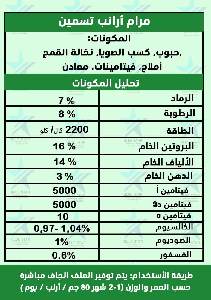 - *1-2 شهر*: 80 جرام / أرنب / يوم.